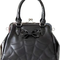 A scalloped-edge faux patent bow adorns the embossed spiderweb design, with a matching faux patent handle and optional shoulder strap.