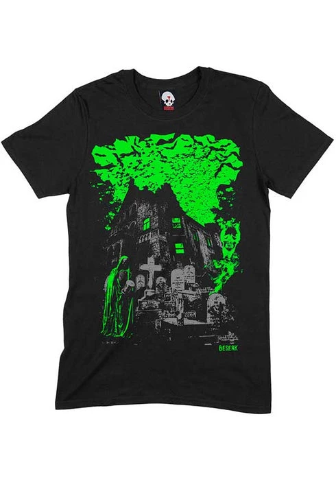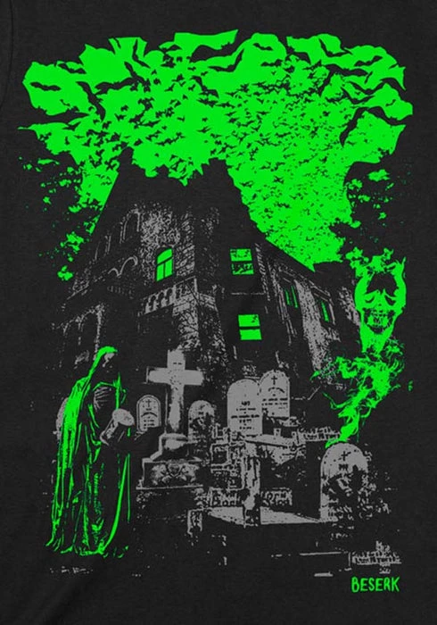 ThisΒ fierce Tee features a creepy haunted house with a swarm of bats, perfect for your dark wardrobe!