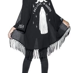 Women’sΒ Oversized Kimono with crochet fringe detail at bottom, moon phase iconography and text “I Believe in Ghosts”.