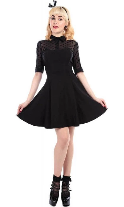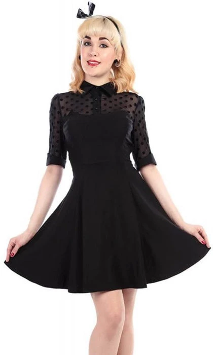 The Wednesday Skater Dress is an ideal style to wear for any occasion. This style, inspired by our favourite goth family, features pointed collar, mesh polka flock dot detail to the shoulders and sleeves, and the main dress is made in a comfy Bengaline fabric. Team with black tights, pumps and knitwear for a gorgeously dark winter outfit.