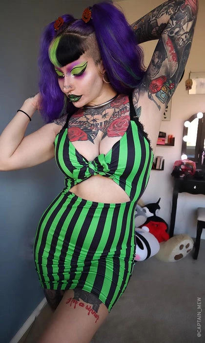 Unleash your inner spooky queen with the Lime Green Beetle Front dress. This dress features super soft stretch fabric and adjustable straps for the best fit. Perfect for a sexy Beetle juice inspired Halloween outfit!