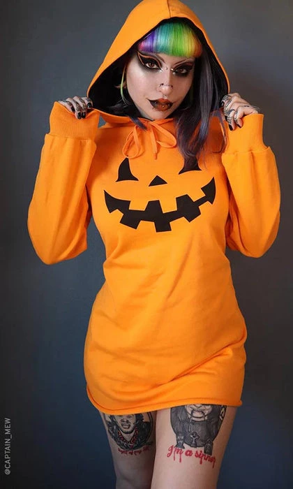 The Haunted Hallows Jack O’ Lantern hoodie dress is the perfect combination of comfy and spooky for either a cozy night in or a fun day out.