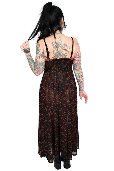 This cute black all meshΒ dressΒ has an all over orange bat design.Β Smocked waist maxi dress with adjustable straps.Β This dress is perfect for layering!Β It is completely unlined and sheer, meant to be worn over another separate piece. (Or nothing at all, we don’t make the rules!)
