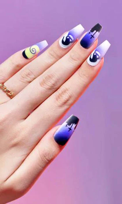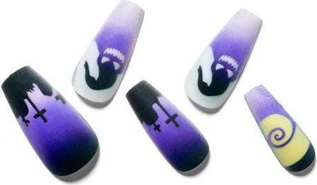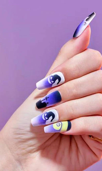 You and a perfect Manicure are simply meant to be… This stunning and spooky purple coffin manicure is of course inspired by our favourite Tim Burton movie, Nightmare before Christmas! Featuring Oogie Boogie, graveyards and even the iconic spiral hill!ย