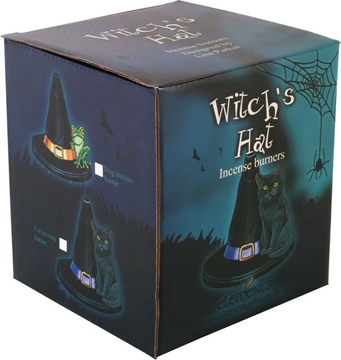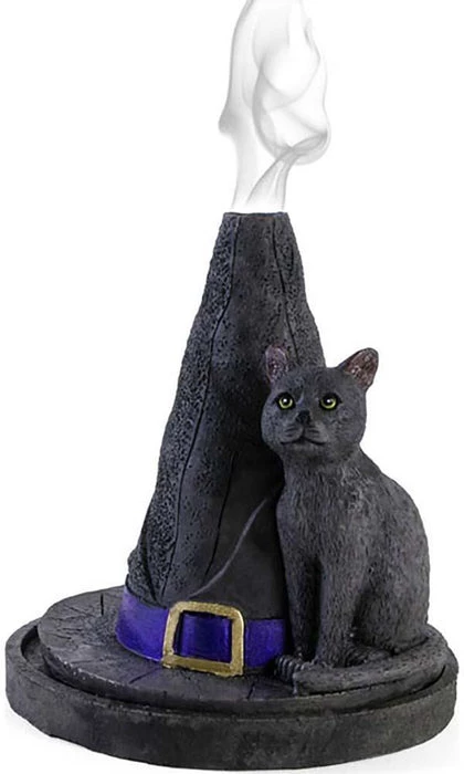 A witch hat with a cat design incense cone burner. When the cone is burning, the smoke rises from the top of the hat. Designed by Lisa Parker.