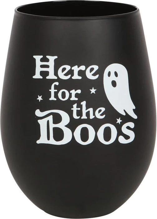 Add your magical cocktail concoctions to this spooky stemless glass featuring the cheeky text ‘Here for the Boos’.ย