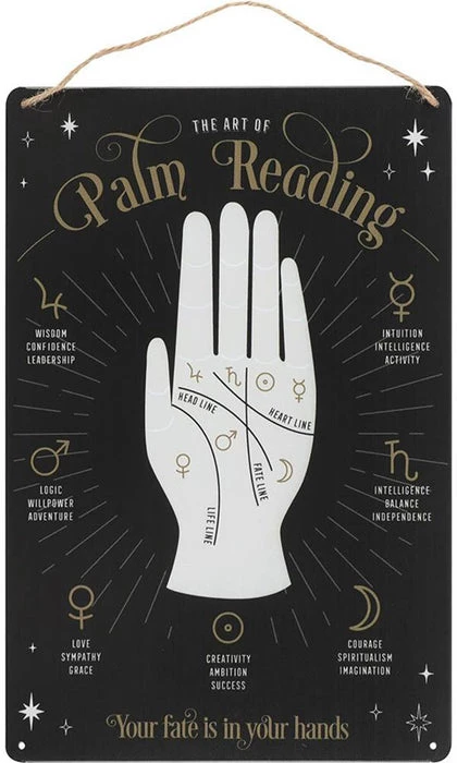 This tin sign features a vintage-inspired palmistry hand illustration with labelled palm lines and astrological symbols. Makes a fun piece of wall dΓ©corΒ for lovers of the strange and unusual.