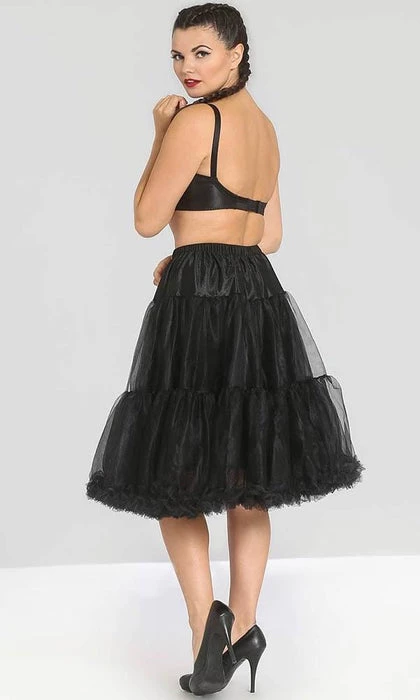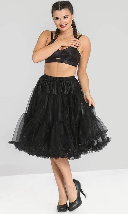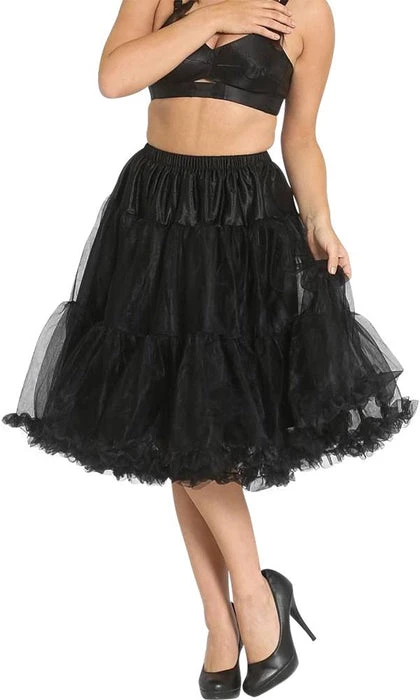 This Black Midi Petticoat is perfect for adding shape to your 50’s dresses, skirts or costumes! It features a tulle layer, ruffle edging and elastic waistband.