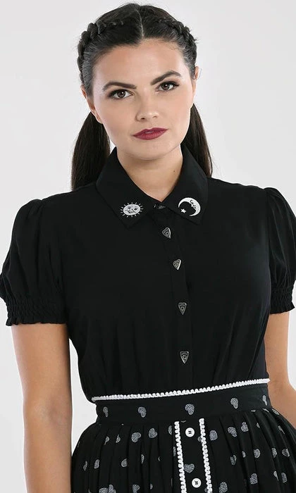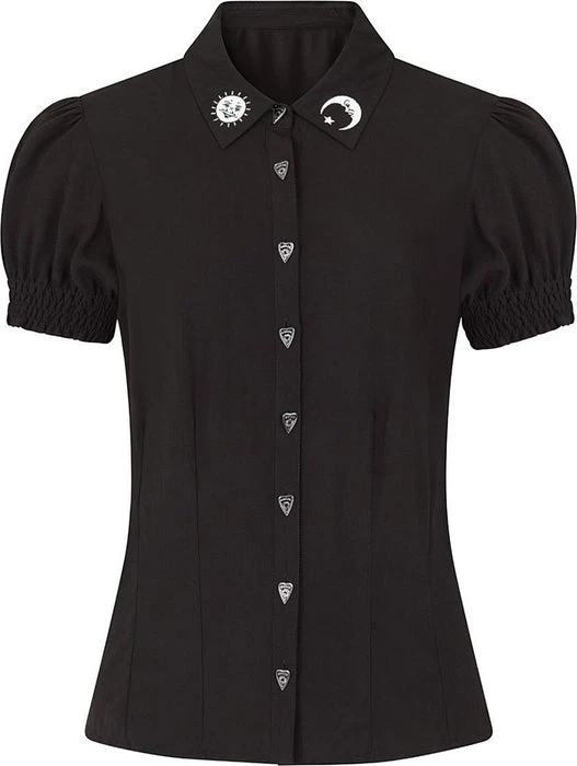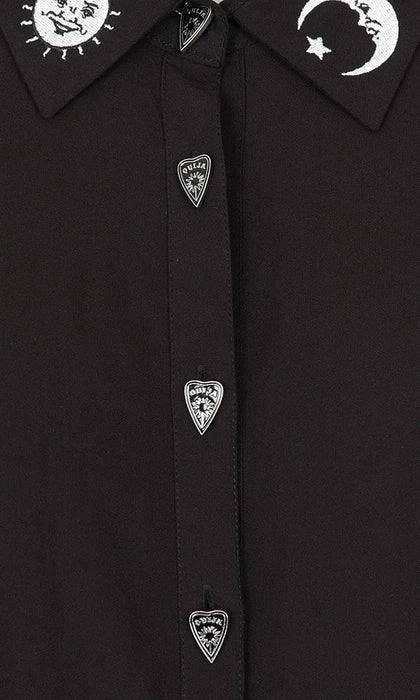 This incredibleย top features a cute sun and moon embroidery on the collar and mini Ouija fastenings down the front.