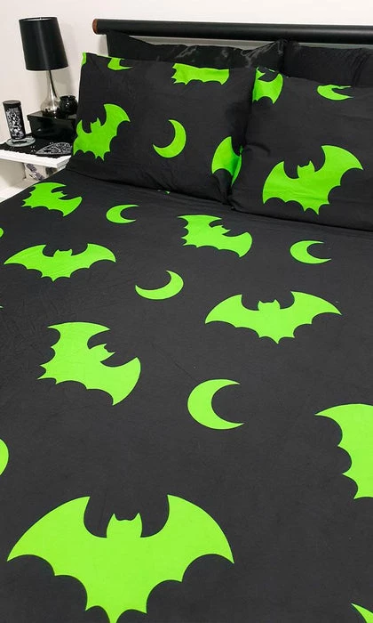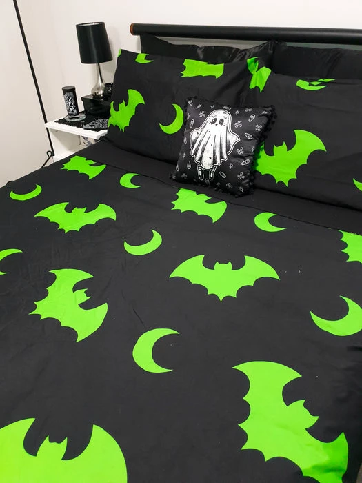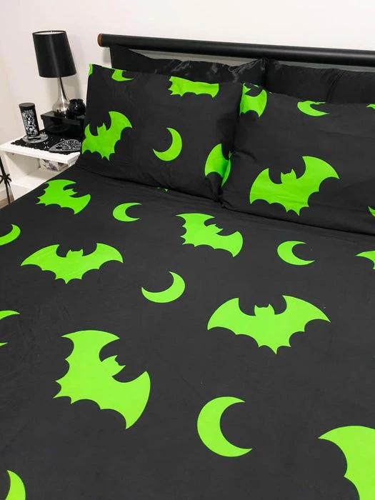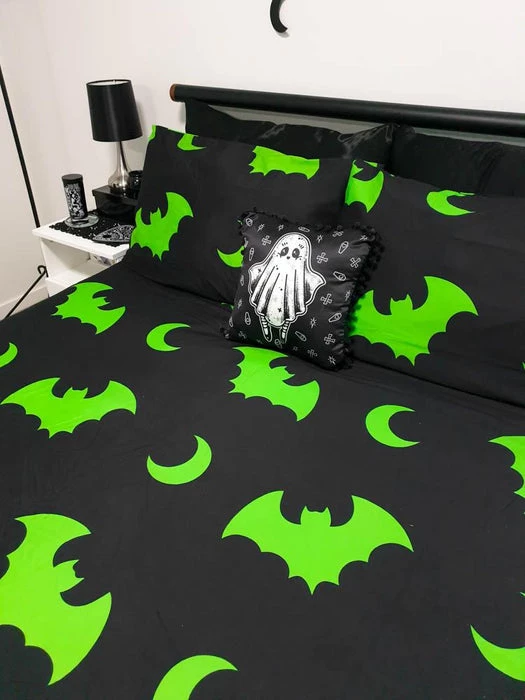 Theย Creature of the Nightย Quilt Setย bringsย spookyย andย macabreย vibes to the bedroom.ย Featuringย an all over Bat and Crescent Moon designย – perfect for anybody who likes to doze on the deadly side!ย