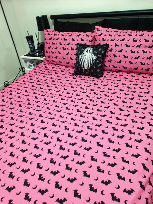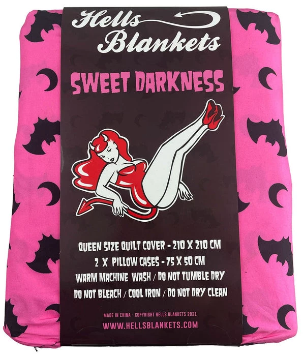 The Sweet Darkness Quilt Set brings spooky and macabre vibes to the bedroom. Featuring an all over Bat and Crescent Moon design – perfect for anybody who likes to doze on the deadly side!