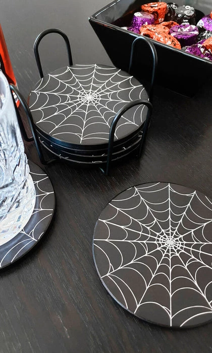 Add a spooky touch to your next dining experience with these hauntingly beautiful webbed coasters! Each set comes with a black coaster holder and matching black box, perfect for gifting!ย