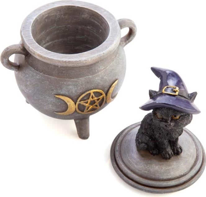 This cute Cauldron Trinket Box will make the perfect addition to your home!Β TheΒ little witchy cat on top and pentacle triple moon add a magical touch!Β