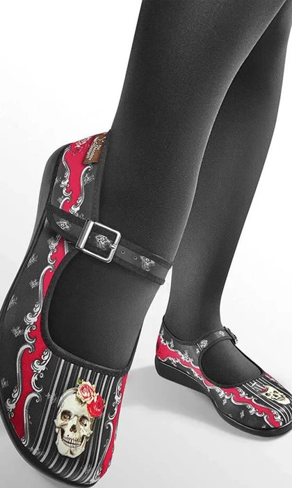Together forever, our beautifully edgy bride and groom skulls grace the toes of these striking black and red stunners!