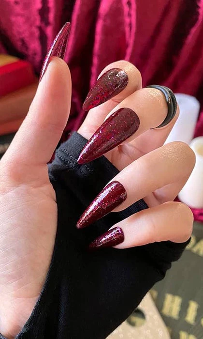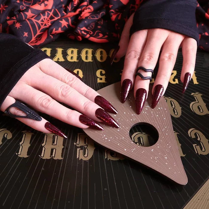 A deep blood red base, stuffed with red and purple glitter and a splattering of holographic glitter for good measure.Β The perfect addition to a goth outfit.Β
