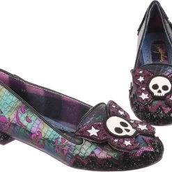 Perfect for those of you who want to be spooky and comfy! The creepy cute skull moth adorns the front of these dark petrol reptile textured flats, accented by the purple and black encrusted glitter zig-zags on the toe and heel. Eerie hot pink embroidered jack-o-lantern faces along the side of the shoe – a perfect little bit of extra scare!