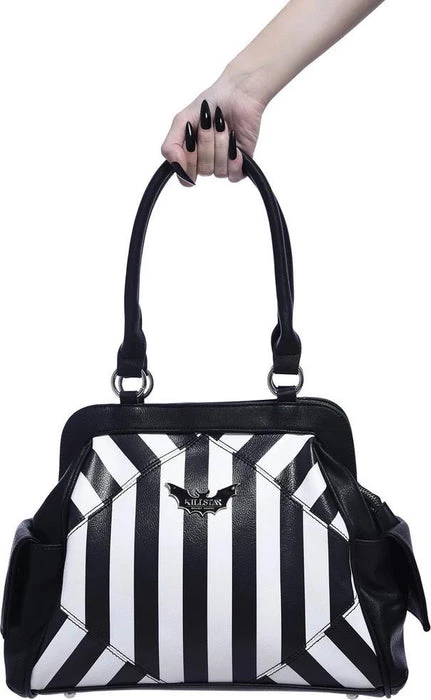 Elevate your handbag game with this statement must-have; ‘Never Trust The Living’ is finished in aย faux leather body adorned with a block-stripe print, branded bat plaque, multiple storage pockets, and zip closure. Detachable shoulder strap when you need it and of course fully lined. Halloween is every day!