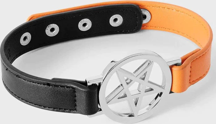 – Statement faux leather, half-and-half choker.