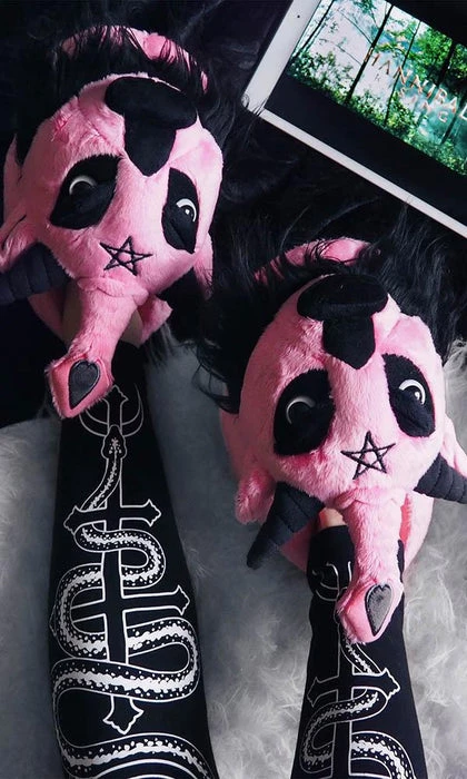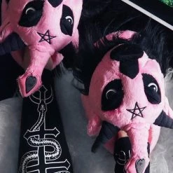 Feel the chill of hell freezing over? Keep your paws cozy with the ‘Dark Lord’ Baphomet slippers in Bubblegum. In a soft fleece material, closed foot styling with a goat-head statement to the front, 3D ears + horns, embroidered pentagram, and fur detailing. Purrfect for when you need to take some time to relax and chill with yer demons.ย