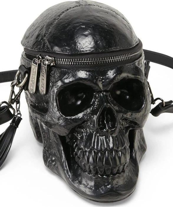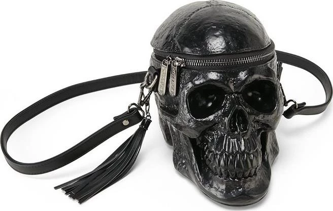 Obsessing about skulls since forever? The ‘Grave Digger’ handbag is your creepy must-have – large human skull handbag – with intricate detailing, zip opening, long shoulder strap and detachable tassel detail.ย All Hail the Halloween Queen!