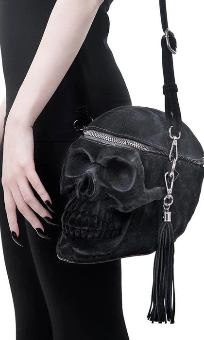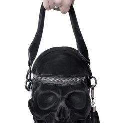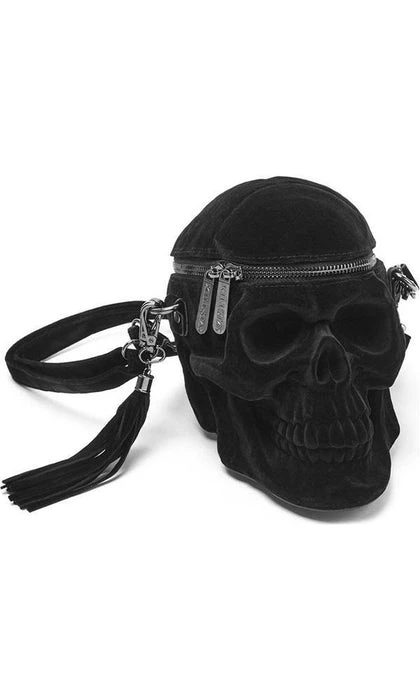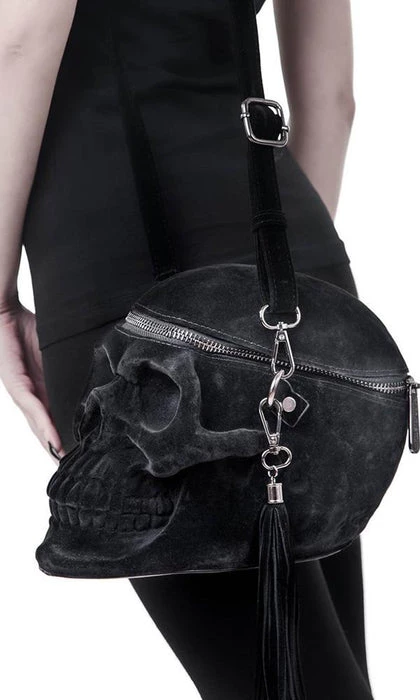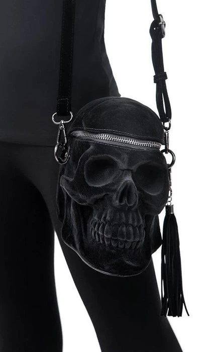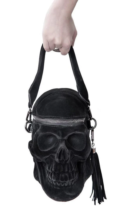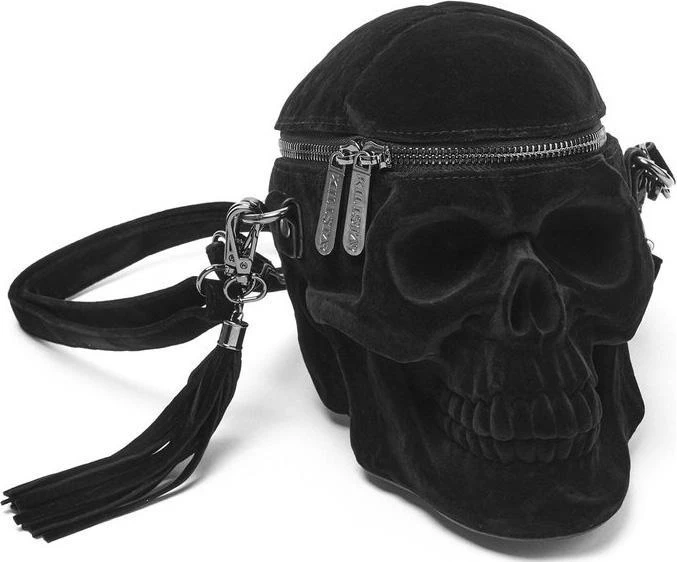 Welcome our newest skull member, in lush velvet coating! The ‘Grave Digger’ handbag is your creepy must-have – large human skull handbag – with intricate detailing, zip opening, long shoulder strap and detachable tassel detail. All Hail the Halloween Queen!
