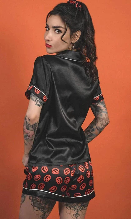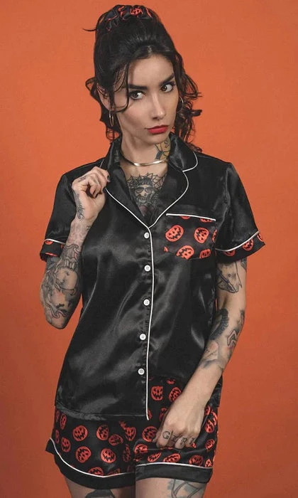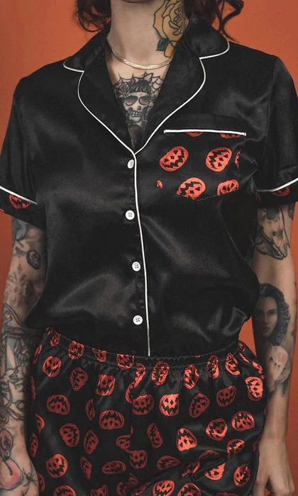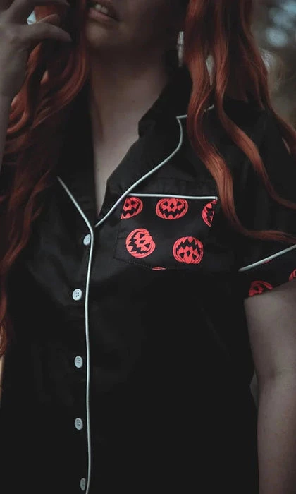 Front: Black + Haunted Hallows repeating fabric. Top ~Β oversized button-up bodice, accented with a patch pocket.Β