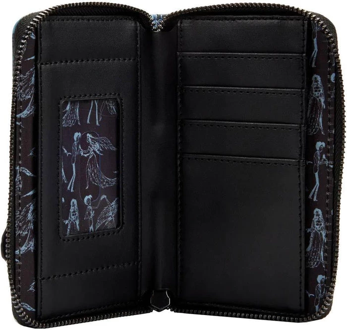 Love can be found even in the strangest of circumstances. The Loungefly Corpse Bride Emily Forest Zip Around Wallet shows an iconic scene from Tim Burtonβs 2005 animated film, The Corpse Bride. On the front, Emily walks through the hazy woods while dressed in her wedding gown. On the back, Emily appears to an unsuspecting Victor as he stumbles through a graveyard. With 5 slots for holding cards and a clear slot for holding your ID, this wistful accessory has room to keep all your belongings safe as you travel between worlds. This wallet is an officially licensed Corpse Bride product.