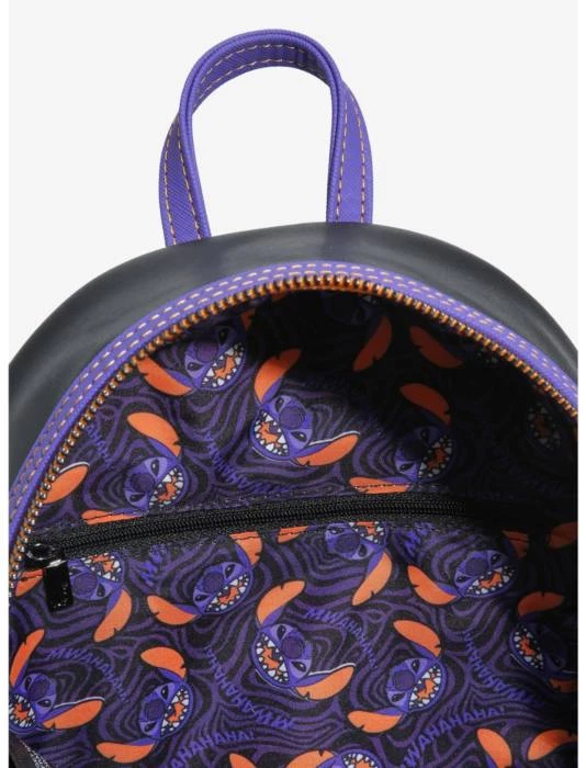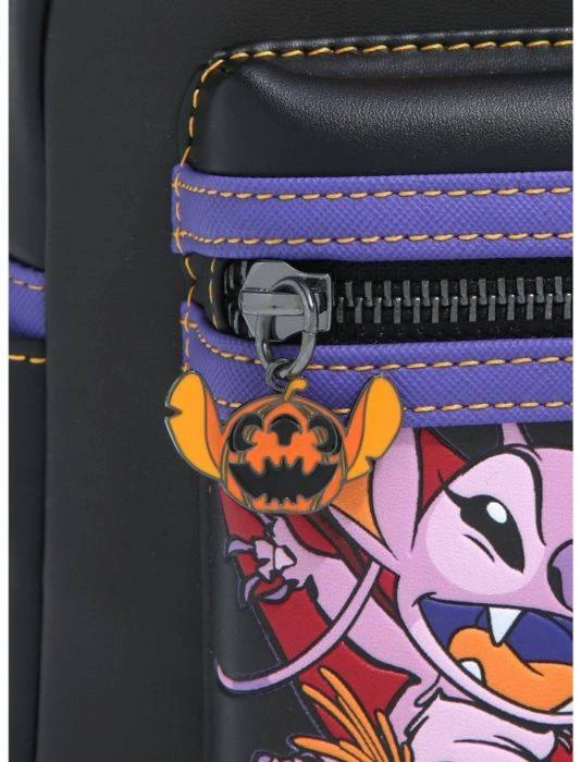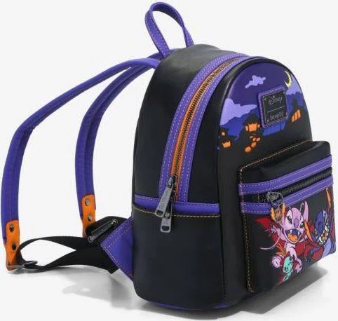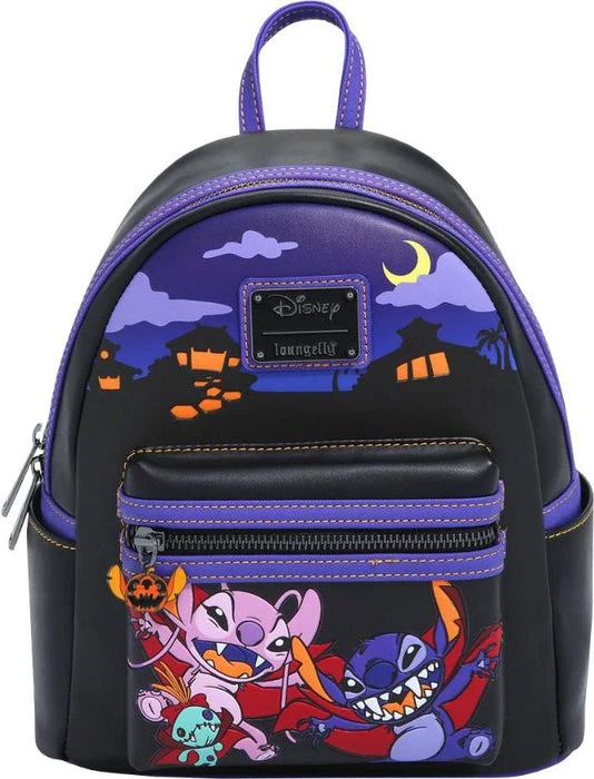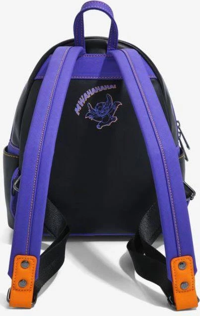 The mood of this Loungefly mini backpack is set with a spooky silhouette of Hawaii after dark, illuminated by orange indoor lights as the moon peeks out from behind the clouds. Stitch, in his vampire cloak, leaps out from the cover of darkness with bared teeth and claws on the front zipper compartment. Jumping in to join him with menacing fangs are Angel and Scrump, both dressed in matching vampire cloaks. The compartment is accessible with a custom-shaped enamel zipper charm of Stitchโs head in the likeness of a pumpkin, complete with his pointy maw. On the back of the bag, in purple and orange linework, Stitch jumps into the air once more as he emits a scary laugh seen in a spookily-stylised font.ย