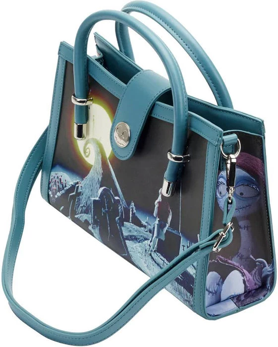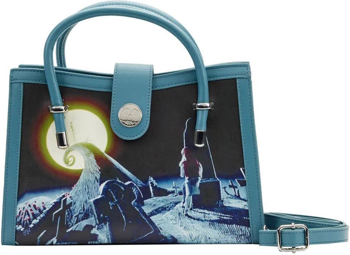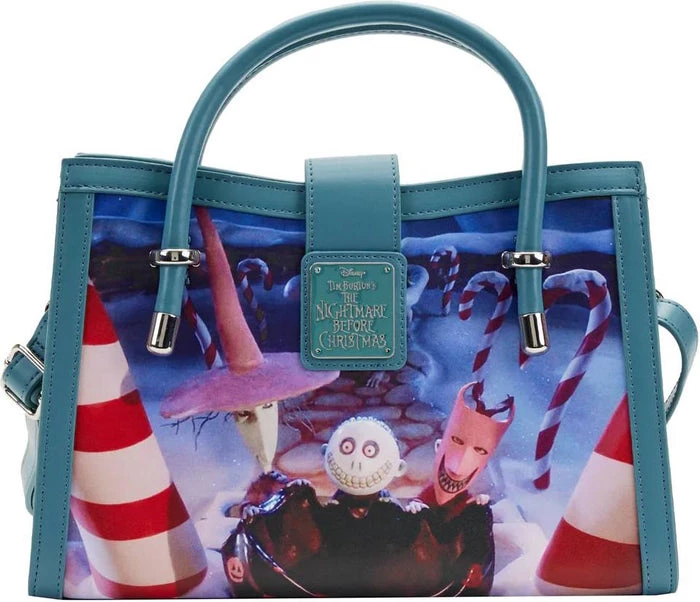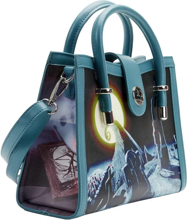 This spooky accessory is simply meant to be! The Loungefly Nightmare Before Christmas Final Frame Crossbody Bag brings to life iconic images from Tim Burtonβs The Nightmare Before Christmas. On the front, Jack Skellington climbs to the top of Spiral Hill beneath a full moon. Shiny silver rivets secure the bagβs handles, and an applique in the shape of Jackβs face connects the bagβs opening. On the back, Lock, Shock, and Barrel wait to cause trouble in a candy cane forest. Sally and Zero the ghost dog appear on the bagβs side panels. This frightfully fun accessory has room to store all your tricks and treats and is perfect for any Disney fan looking to keep one of their favourite movies close.