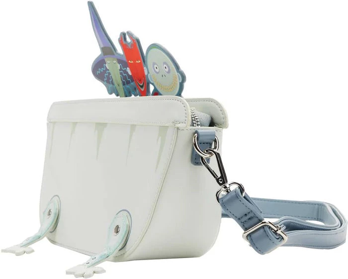 The Loungefly Nightmare Before Christmas Lock Shock and Barrel Bathtub Crossbody Bag is made of vegan leather (polyurethane). Bag has adjustable, removeable shoulder strap and sturdy metal hardware. Additional features include applique, printed, and glow-in-the-dark details. Take note of the coordinating inside lining.