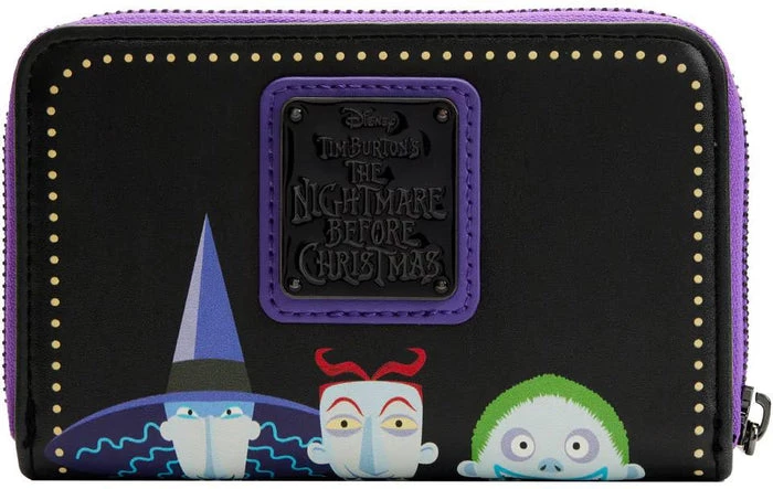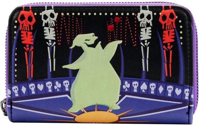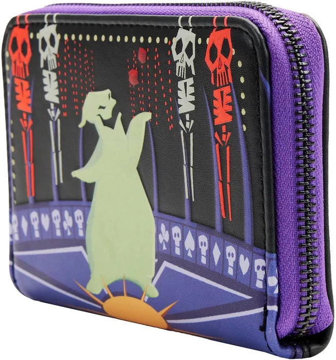 The Loungefly Nightmare Before Christmas Oogie Boogie Zip Around Wallet is made of vegan leather (polyurethane). Wallet zips closed with sturdy metal hardware. Additional features include debossed, printed, and glow-in-the-dark details. Take note of the coordinating inside lining.