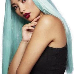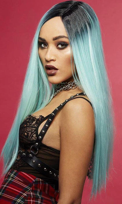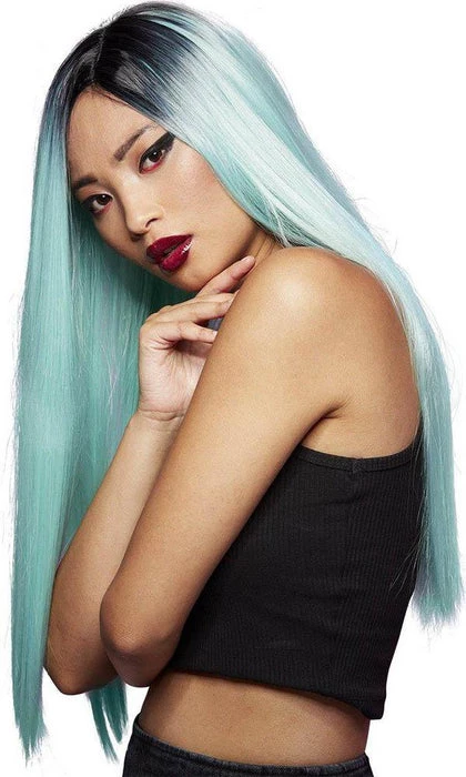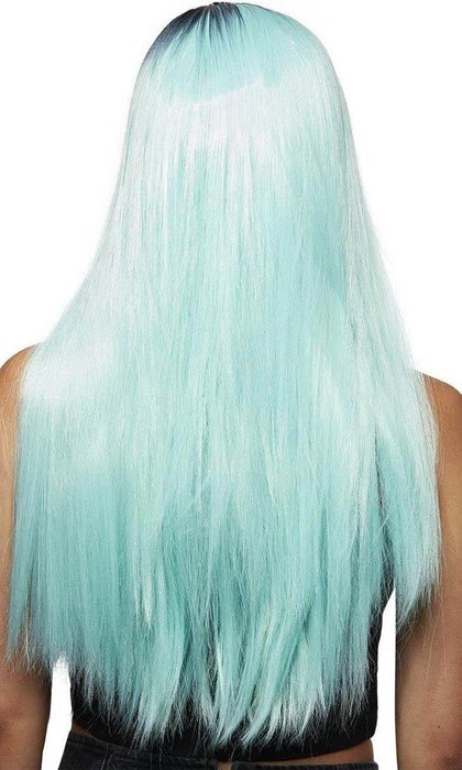 Long, straight heat styleable wig with side parting and dark root in our minty fresh pastel green Sea Nymph Creamtone color.