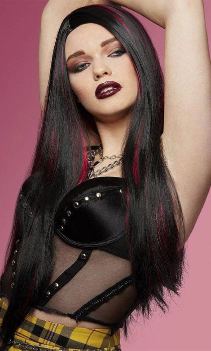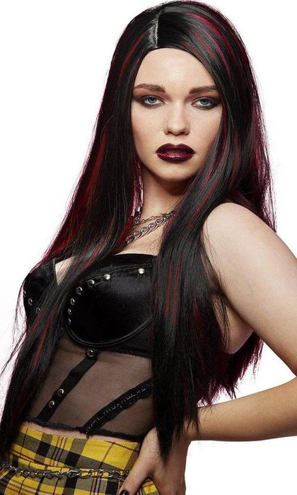 Long, straight heat styleable wig with side parting in deep Raven black with vibrant streaks as blood red as a Vampireβs Kiss.