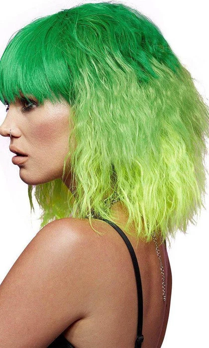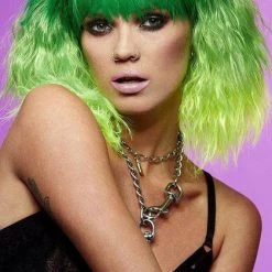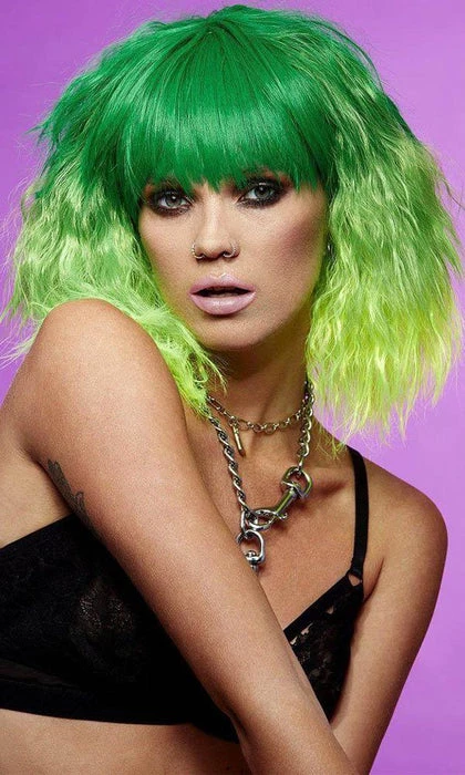 Mid-length heat styleable wig with bangs in an electric green to neon yellow ombre style. Make everyone green with envy in this shocking blend of Venus Envy into Electric Banana.