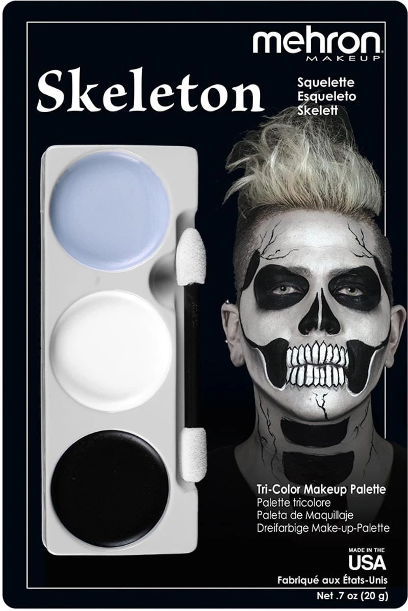 Each Tri-Color Palettes contains three colors of Mehron’s professional cream makeup to create the character pictured on the blister card. Each card comes with detailed instructions on how to apply the makeup and also lists items that will complement the character you are creating. As with any professional cream makeup, Mehronโs Tri-Color Palette makeup should be โsetโ with setting powder. Available in a variety of characters. Remove with makeup remover followed by soap and water.ย