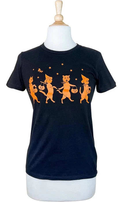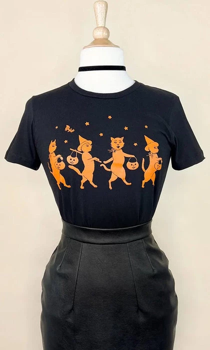 Conjure some vintage style in this beautiful tee. It’s lightweight, soft black and orange colours features a cute spooky design and looks incredible paired with capris or with a biker jacket!