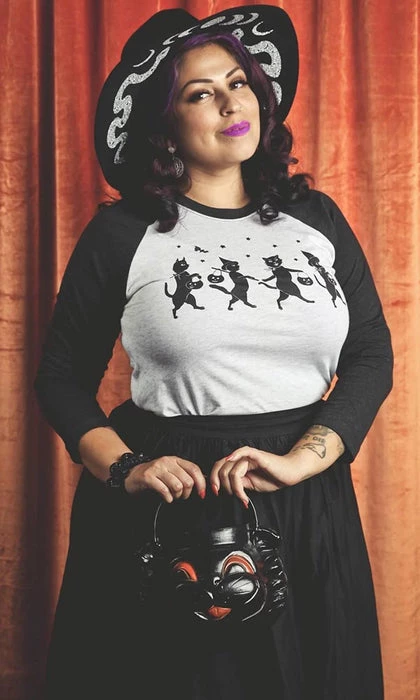 Conjure some vintage style in this beautiful raglan tee. It’s lightweight, soft black and white colours features a cute spooky design and looks incredible paired with a biker jacket or a pencil skirt!