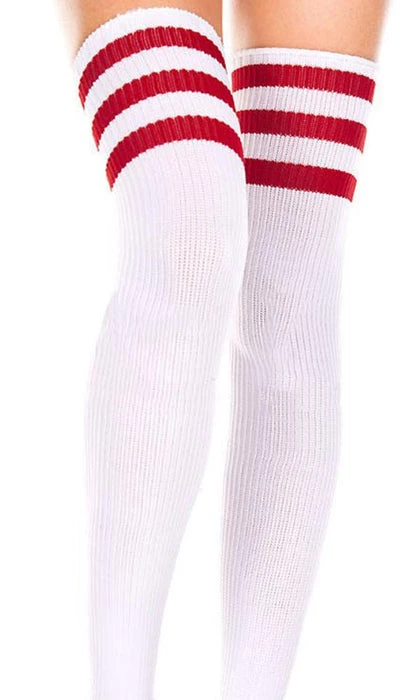 The Athletic Striped White and Red Thigh Highs byΒ Music Legs are the perfect addition to any outfit, costume, or cosplay. These thigh highsΒ feature redΒ stripes at the top on a plain whiteΒ background.