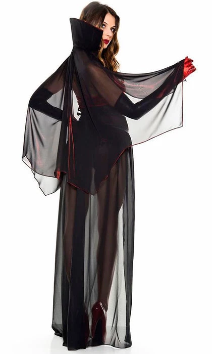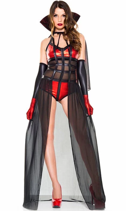 Stalk your prey in this Bloody Vixen Vampire costume featuring a metallic red romper with a V-neckline, halter straps, a sheer mesh bodice with cage detailing, an attached sheer train, a short sheer cape with a red trim, a high stay up collar, a front tie closure, and watching black and red gloves. Perfect for a spooky evening!