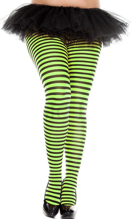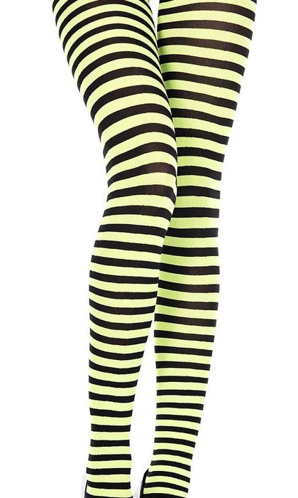 These Black and Neon Green Tights from Music Legs are the perfect addition to your next Costume, Cosplay, or Gothic Punk Outfit. Featuring small horizontal stripes and bright, bold colours, these opaque tights are not for faint-hearted!