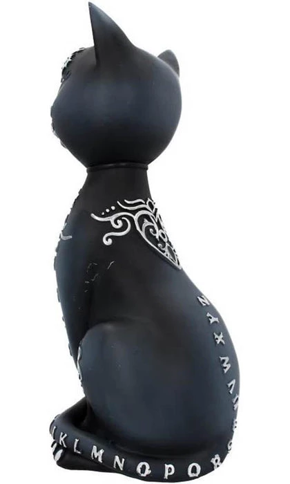 Walk and talk between worlds with the Mystic Kitty. Sitting up, this black cat looks at you inquisitively, large purple eyes portraying a preternatural intelligence. Silver letters and numbers cover their fur, mimicking a spirit board – the numbers 0 to 9 are down their front legs, “Yes” and “No” are written on their knees, and the letters of the alphabet start at the tip of their tail and continue up their back. A baroque heart-shaped planchette design is repeated on their front and their back, and the word “Goodbye” appears below the silver pentacle hanging from their collar. A pyramid with an eye in it is picked out on their forehead. Cast in the highest quality resin before being carefully hand-painted, this mysterious feline can add an air of magic to any home.