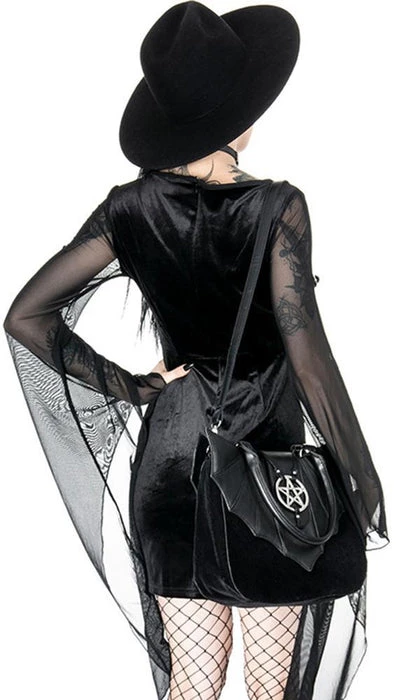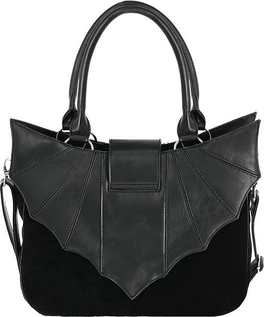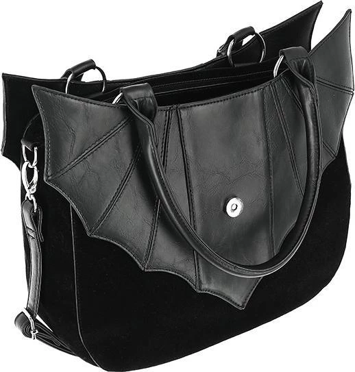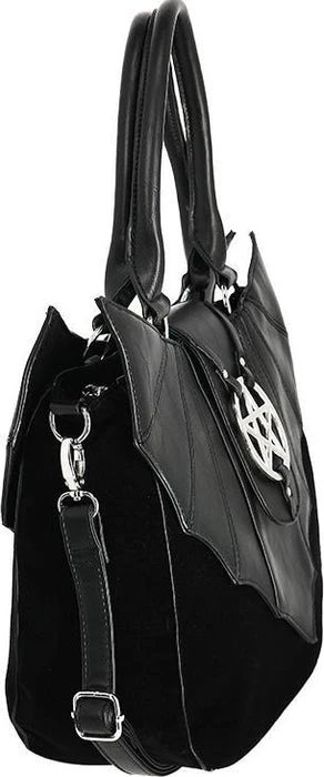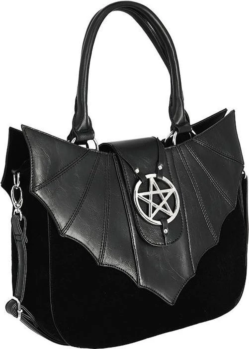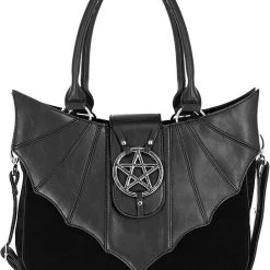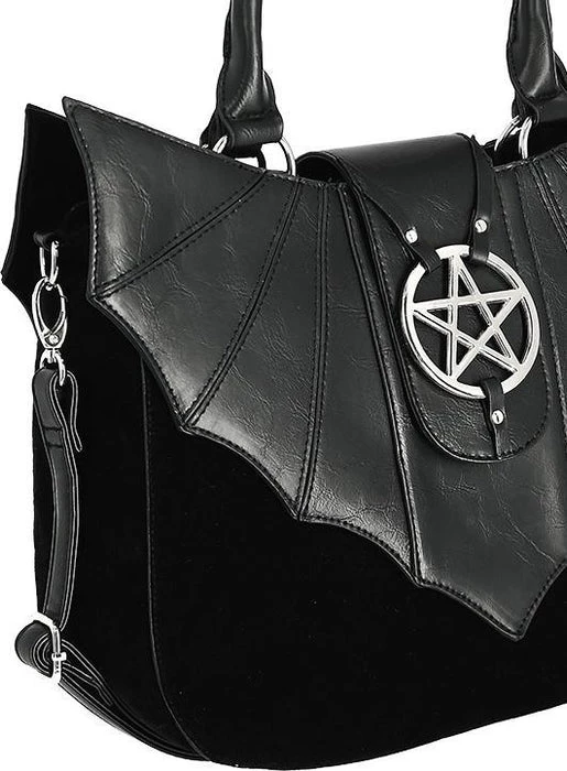 Elegant, gothic purse with pentagram and bat wings. Made of solid and durable firm velvet with vegan leather bat wings. Featuring a strap opening with metallic pentagram decoration, black inner lining with inner zip pocket, and a long adjustable shoulder strap. Perfect for every goth girl who loves dark things.