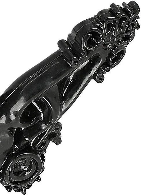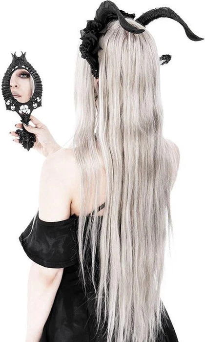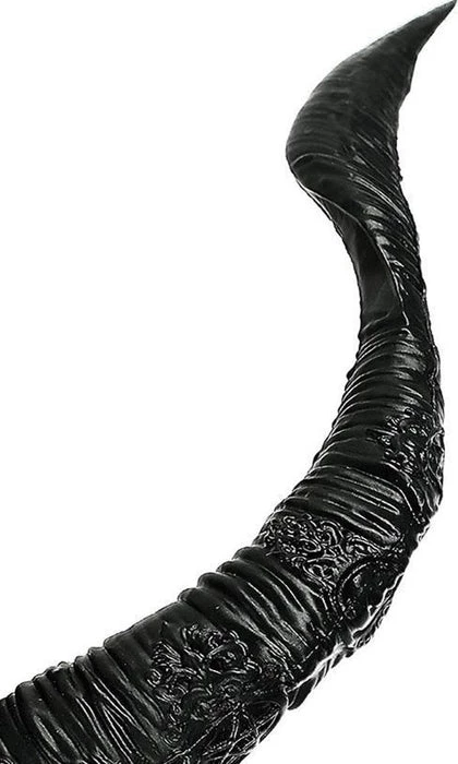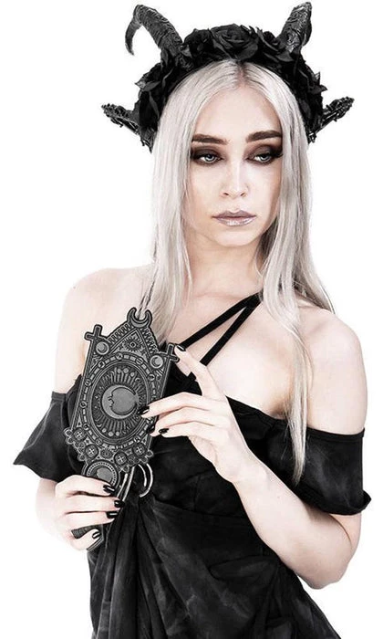 This gothic headband features black goat horns, embossed with a baroque-cosmic pattern which are adorned along the entire length with large black roses and finished with elven ears, decorated with a gothic pattern. The construction of the horns is made of solid plastic and they are attached to the headband with screws while the underside is protected with a soft fabric so that the connection doesn’t get caught in your hair.