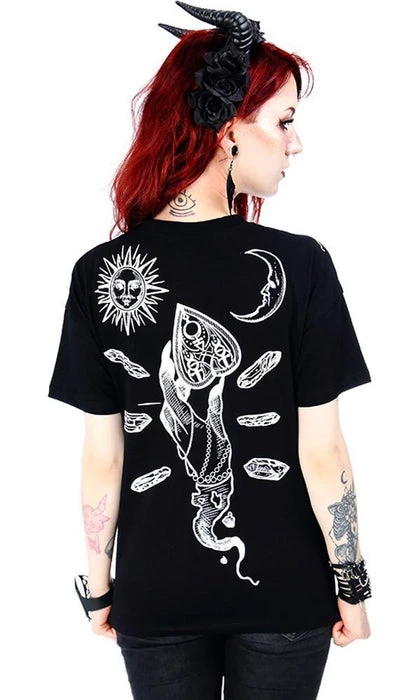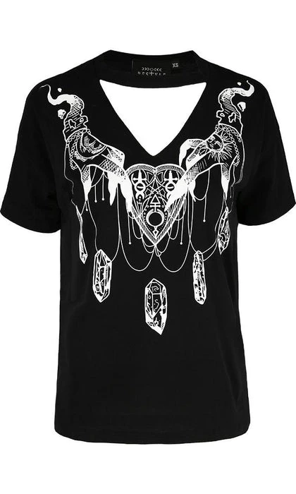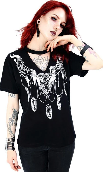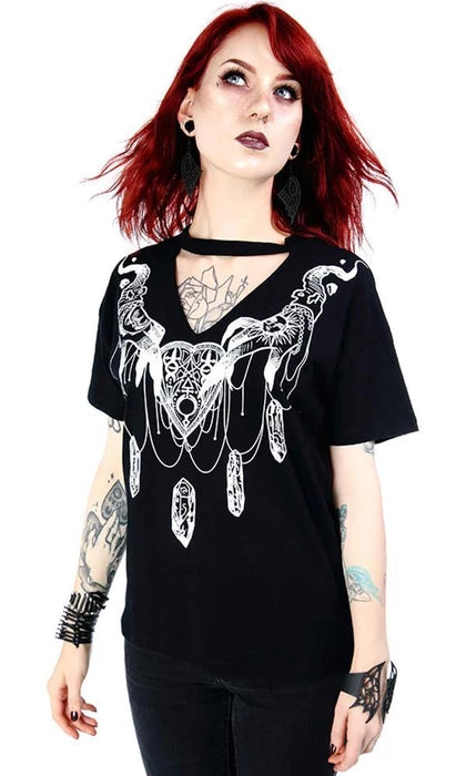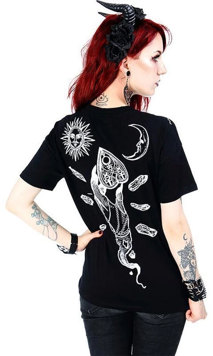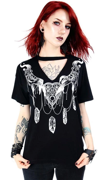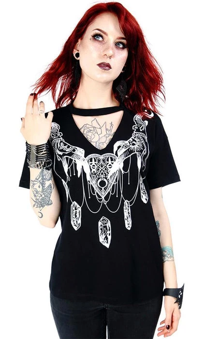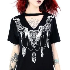 The Haunted Top by Restyle is a little bit cute and a little bit badass. This top is made fromΒ a soft black cotton and features a slightly oversized design, unique V-neck cut out, and choker-style neckline with a contrasting white print on black background. Perfect for casual witchy days!
