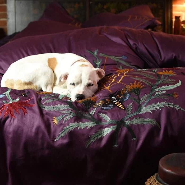 On a deep eggplant base, the Forest Witch Duvet Cover revealsΒ a botanical scene with a golden thread spider web,Β spider, death moth, bugs and foliage. It takes over 500 stitches to create this scene with luscious gem-tonesΒ evocative of the woods from which this inspiration comes. CoordinatingΒ Shams have spider webs creeping from the corners, as they do…Β