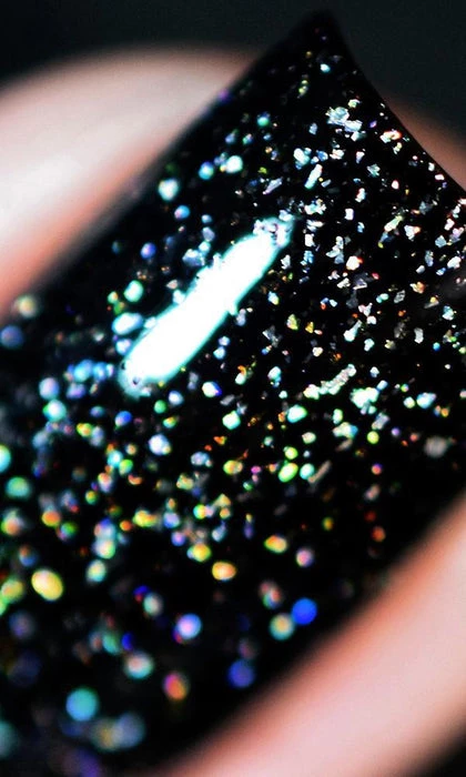 Adrenaline has a deep velvety black base and sparkling holographic micro flakes. TheΒ holographic flakes dazzle and gleamΒ under different lighting. Dries semi-matte, a glossy top coat isΒ required.Β