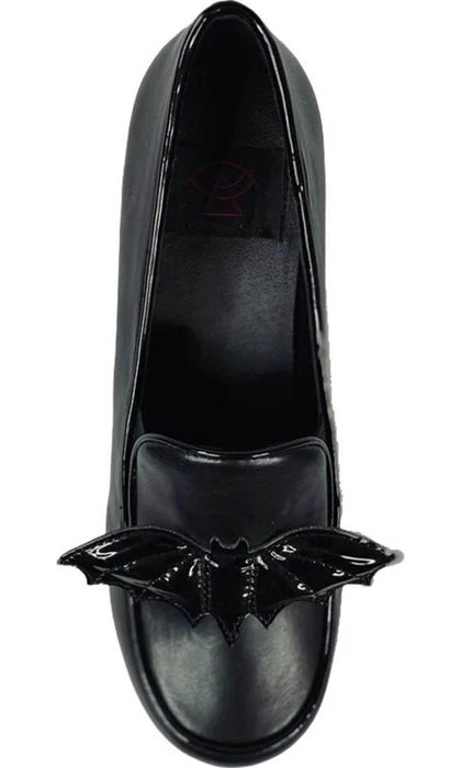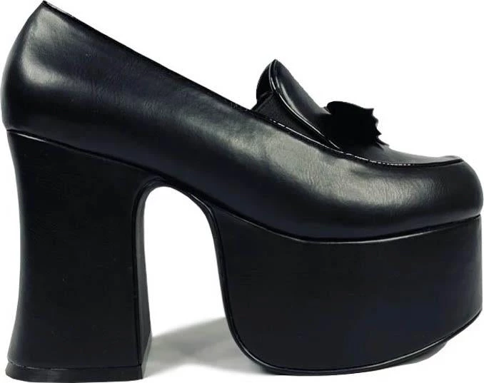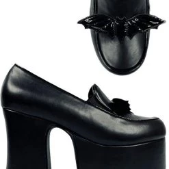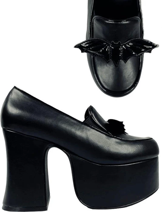 These Chunky Platform Heels are screaming to be worn! Featuring Gothic Black Vegan Leather topped with a spooky cute Black Bat, they’re perfect for wide leg pants and a witchy attitude!