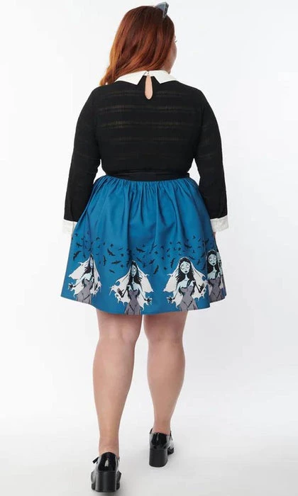 This sweet skirt in collaboration with Corpse Bride, is crafted in a fabulous blue woven that boasts a sweet border print of Emily the Corpse Bride. The black banded waist features attached self ties, while the flare skirt dances above your knees.